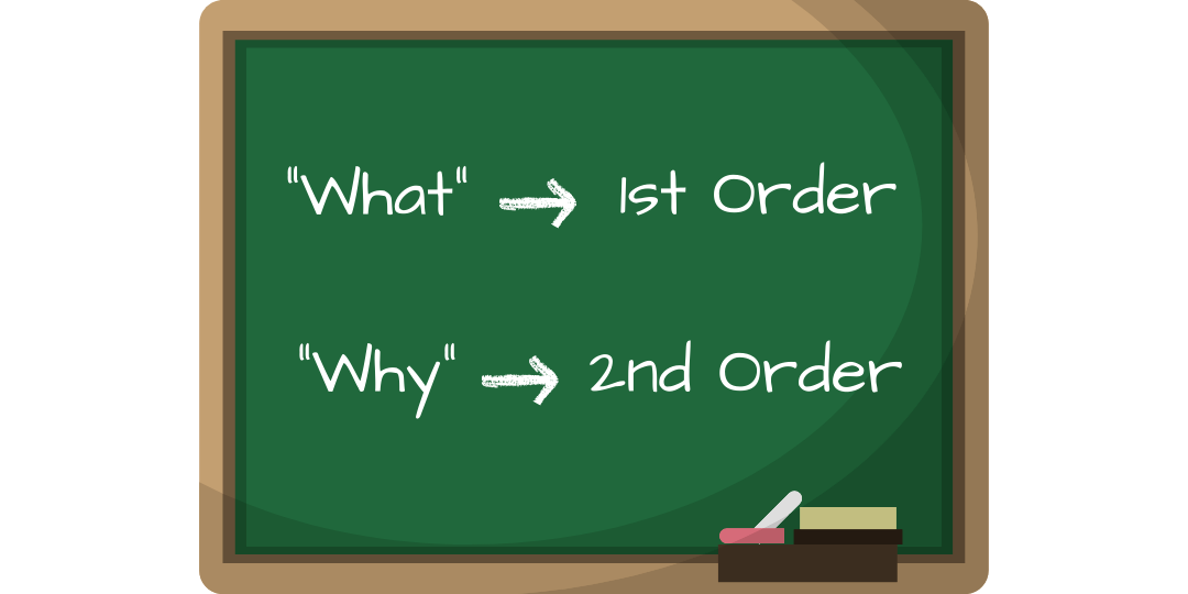 These deficiencies come from focusing on “first-order” thinking: addressing the individual problem as presented with a singular, finite answer. You and your teams can do better than that though. When you instead look to create broader understanding and answers that explain how to reason about multiple finite questions, its a force multiplier for everything you do. “Second-order” thinking is why you examine what broader rules or guidelines produce a specific answer, providing the context or rules behind the knee-jerk response. If you’re asked a question, a first-order response is what that answer would be. A second-order response would be to explain the reasons why it is that answer.