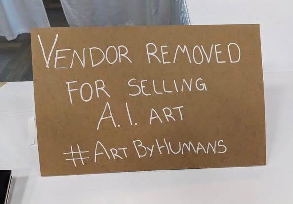 The recent drama at DragonCon captures this perfectly. A vendor was escorted out by police after complaints revealed they were selling AI-generated images as original art. They'd applied with hand-painted pop culture pieces, then switched to selling AI work once approved. When confronted, the vendor became hostile: "You guys are sore because you don't sell sh*t and will be forever broke." The incident was celebrated online as "a victory for humans." But beneath the policy enforcement was deeper unease. If anyone can generate professional-looking illustrations in seconds, what happens to the idea of being an "artist"? The fear isn't just economic competition—it's the collapse of boundaries that once felt solid.
